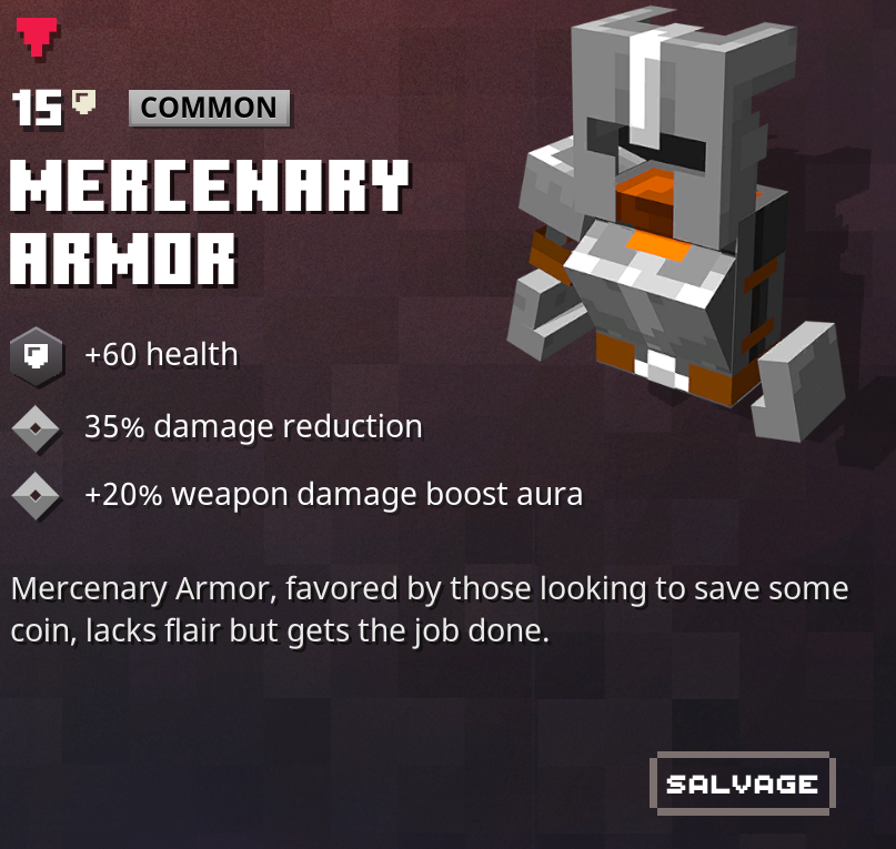 雇佣兵盔甲(Mercenary Armor)是Minecraft Dungeons中的盔甲。它的独特品质变种为叛节之甲、饥饿怖鬼和饕餮怖鬼。