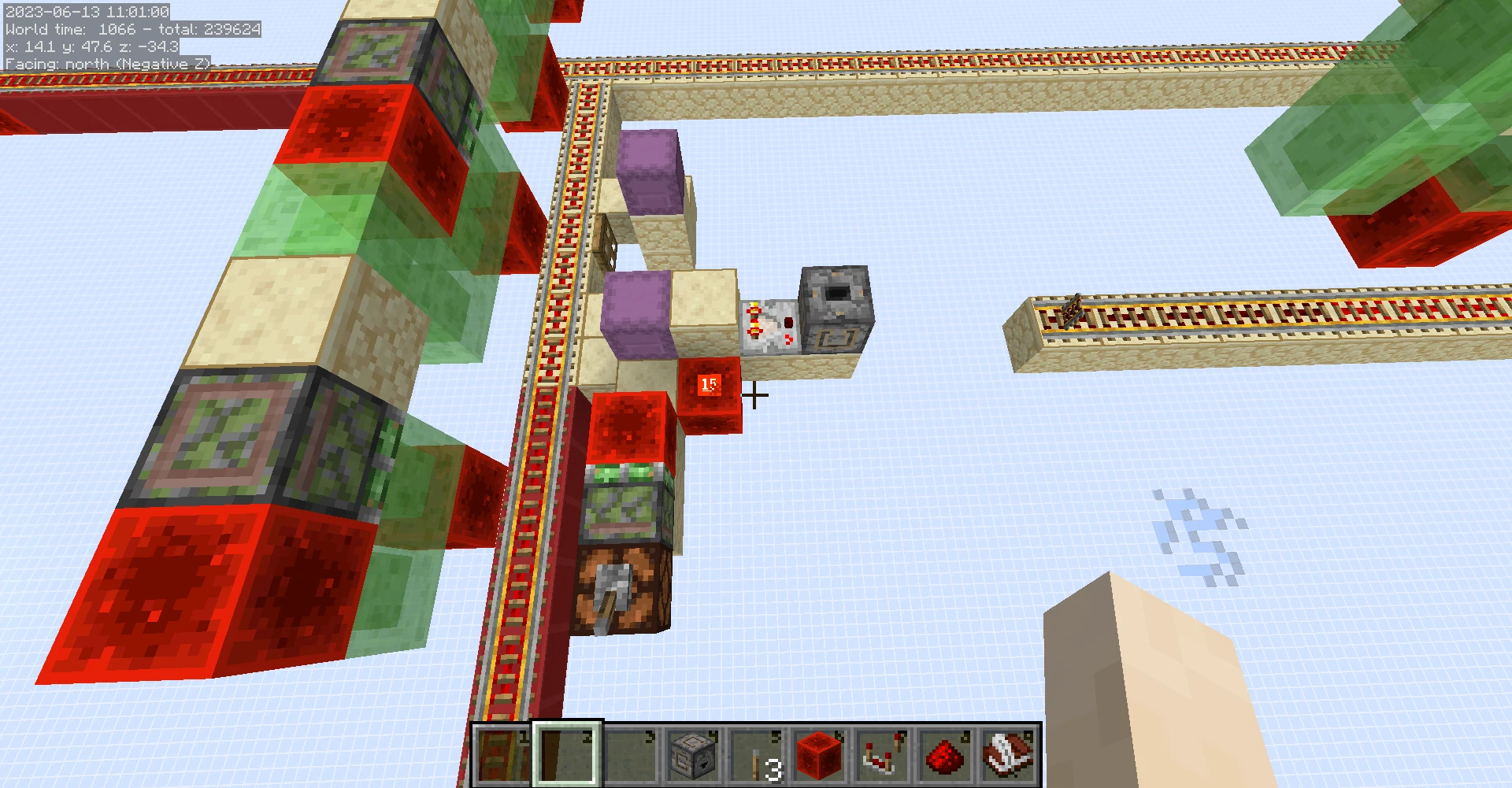 現在,我們在保留方塊實體地拆掉講台之後,在那個位置放一個界伏盒上去,就可以得到一個有講台方塊實體的界伏盒了。這就是我們的強轉抑制器的核心,更新一個從它這裡取輸出的比較器,就會觸發基於CCE的更新抑制。