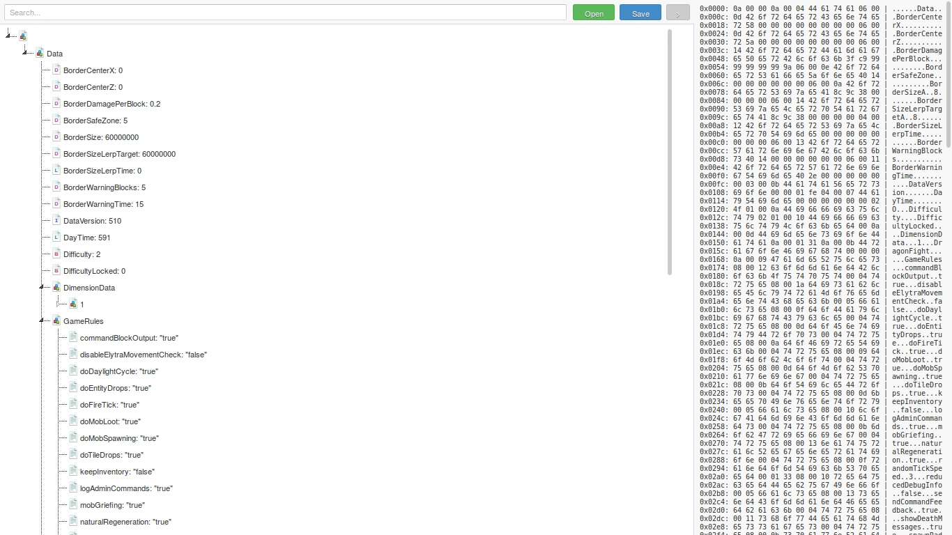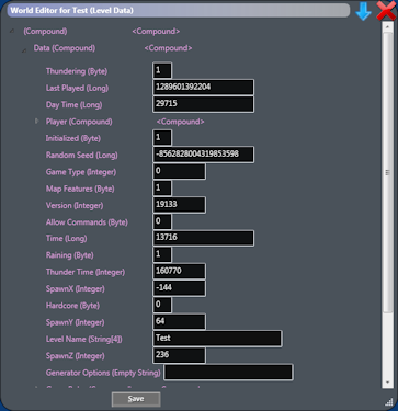 | NBTEdit | 19132 | 可以以Windows资源管理器的方式查看并修改NBT文件。但是由于其版本陈旧,不支持多标签以相同名字出现,并会强制修改类型,这一软件缺乏对未经压缩的NBT文件的支持。 |