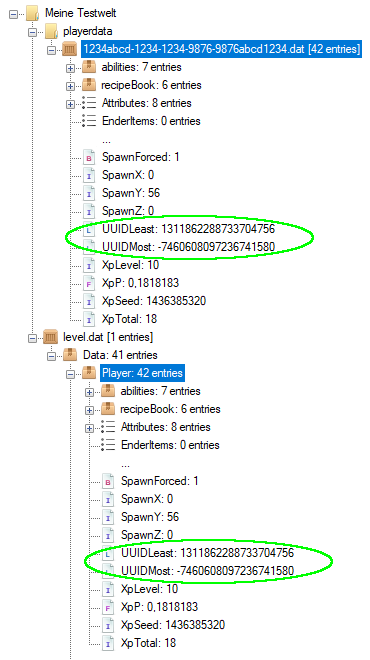 NBT資源管理器中的資料樹:「我的測試世界」在所有曾經進入這個世界的玩家的「玩家資料」資料夾中都有玩家資料。 在這裡你可以看到UUID為1234abcd ...的玩家。 玩家資料包括兩個項目資料條目:EnderItems(EnderItems)和玩家的庫存(Inventory)。 每個項目都有一個計數和一個ID,在容器或庫存中有物品槽。 一些物品具有其他特徵標籤,鐵鎬例如 耐久值「傷害」。