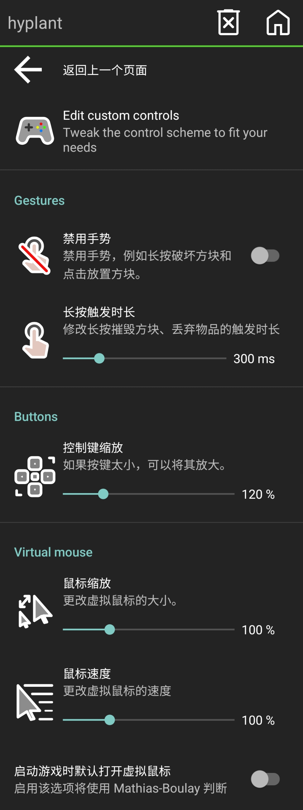 • 长按触发时长:调整 长按破坏方块、长按物品栏位置丢弃物品的时长。